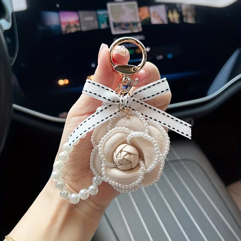 シングルエレガント「椿の花キーホルダー」ロブスタークロークラスプ付き - ティーフラワーバッグチャーム、デコレーションキー、日常使い&特別な日に - ティーフラワーアクセサリー